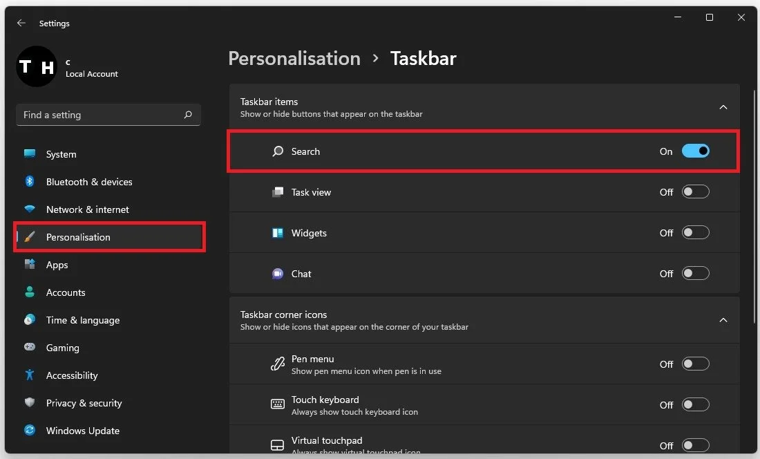 Head back to your Personalization settings and select Taskbar. Ensure the Search option is enabled. This will not only add the search icon in your taskbar but can also fix the issue when your start menu search is not working.