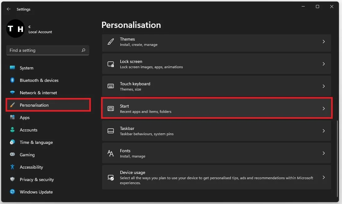 Windows Settings > Personalisation > Start