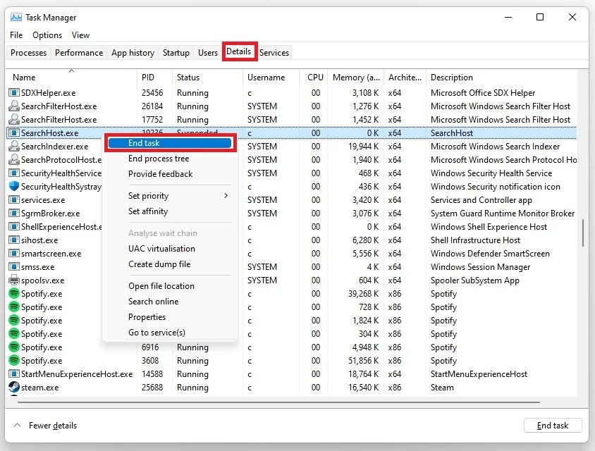 In the Details tab, select any process and start typing SearchHost. This should highlight the SearchHost.exe process running on your system. It might say that the process is suspended, but this is not an issue. Right-click the process and select End Task. This will restart the SearchHost process and fix the start menu search not working problem on your Windows 11 PC.