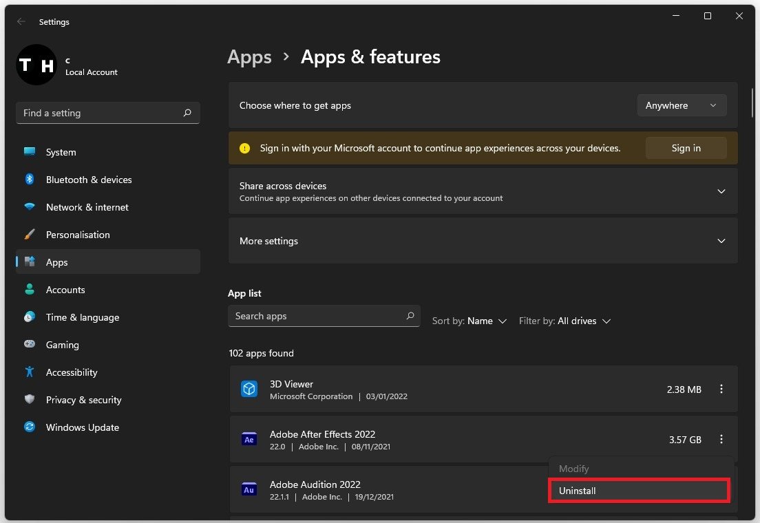 To further improve your Windows 11 performance, uninstall unused applications and programs on your system. To do so, search for Apps in your start menu search to open up your Apps & Features system settings window. Search for specific apps, and filter them by drives on your PC. To uninstall a program, click the burger menu next to the app’s name and select Uninstall.