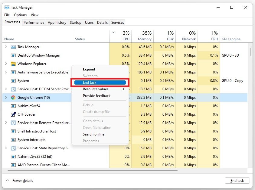 Open up your Task Manager by searching for it in your start menu search. On this window, in the Processes tab, end some programs from running on your PC which could use up your available resources, such as Adobe applications, OBS, Discord or your browser running in the background.