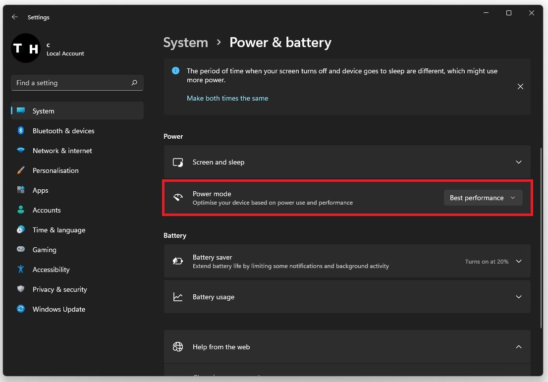 Under Power & Battery, change your Power Mode to Best Performance. This can use up more power, or battery if you are using a laptop but it’s suggested to use this mode when plugged into a power source to fix potential lag on your system.