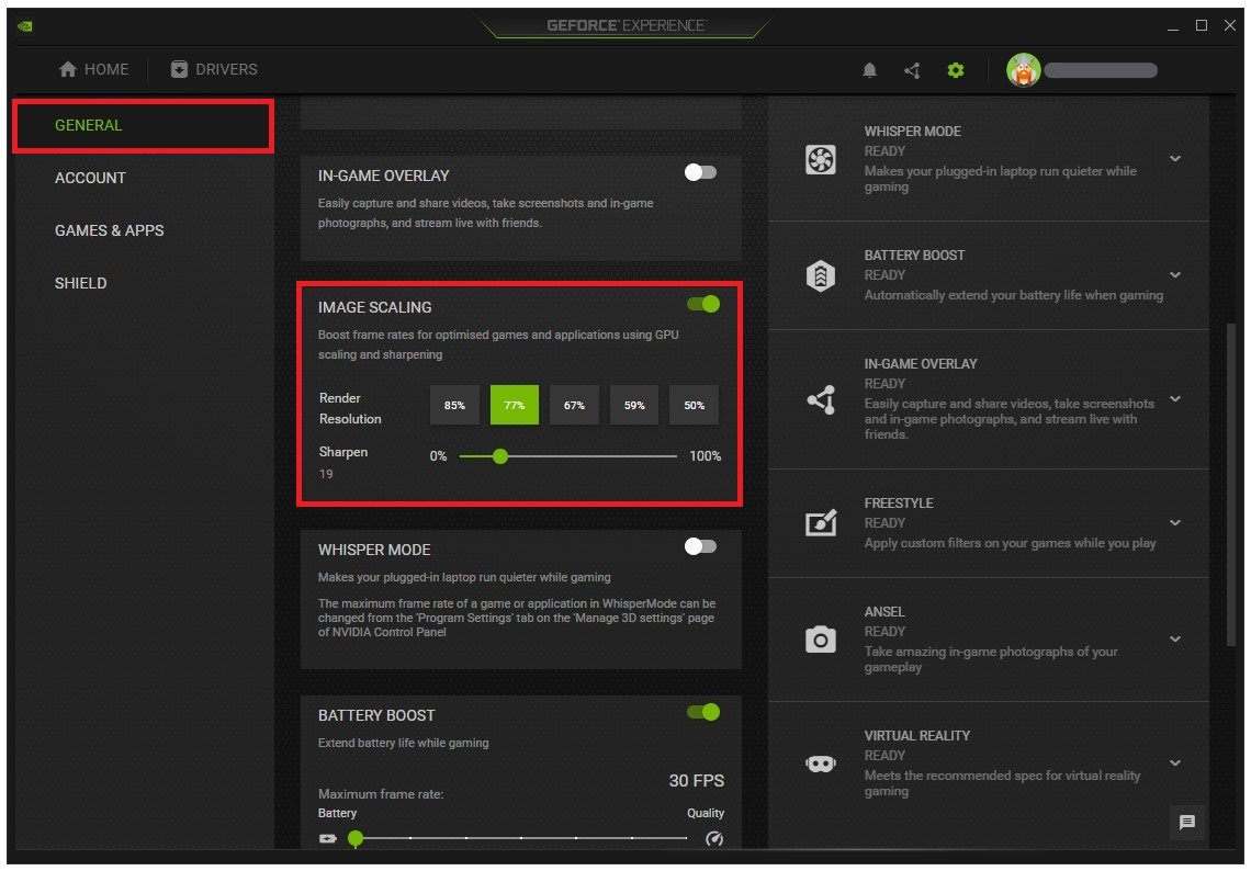 After the installation is complete, navigate to your settings. In the General tab, scroll down to enable the Image Scaling option. Set the Sharpen option to around 20%. This will increase your gaming performance for all games you’ll be playing on your Windows 11 PC.