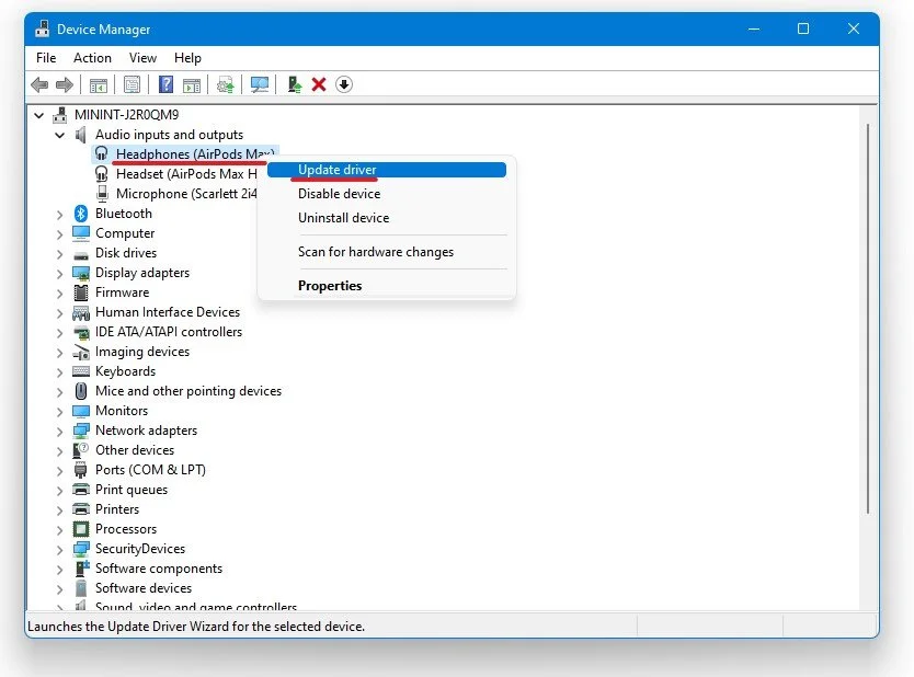 Device Manager > Audio Inputs and Outputs > Update Driver