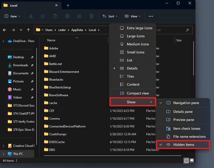 From here, navigate to AppData > Local. To view hidden items, click on the View tab and check the box for 'Hidden Items.'
