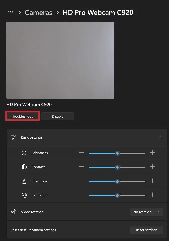 When selecting your camera, you can go ahead and preview the video output and change some basic settings below for most connected webcams. You can also troubleshoot common software issues for your connected camera.