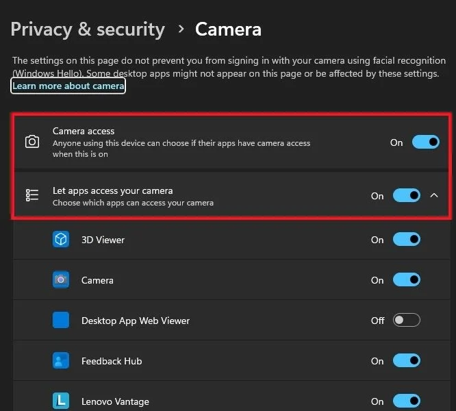 Make sure that both the Camera access and Let apps access your camera options are enabled. This will ensure that your privacy settings are not hindering your camera from being used on your PC.