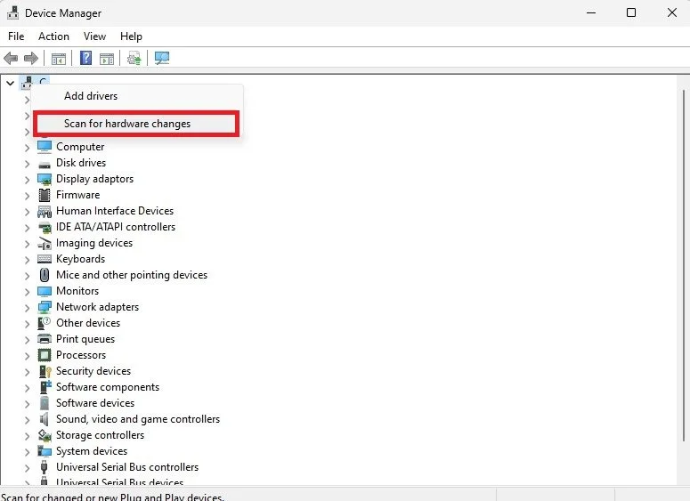 To fix this, open up your Device Manager by searching for it in your start menu search. Here, right-click your PC username and select Scan for hardware changes. It may take a couple of seconds for all devices to appear again.