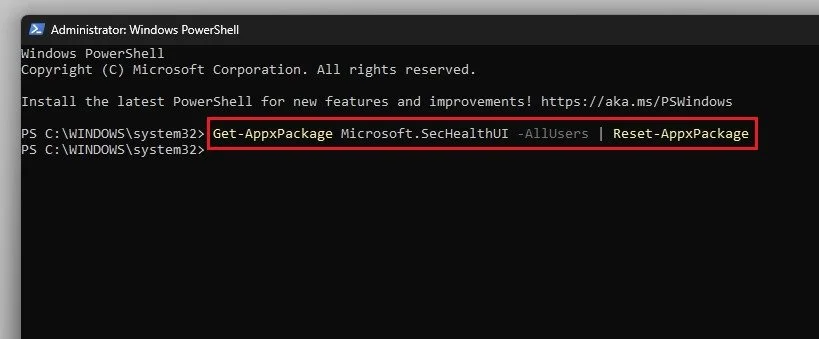 Get-AppxPackage Microsoft.SecHealthUI -AllUsers | Reset-AppxPackage