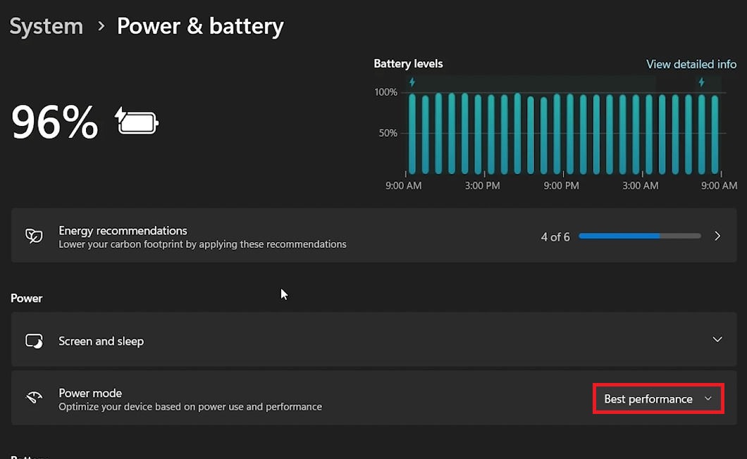 Setting your power mode to "Best Performance" maximizes your PC’s processing power for tasks, including gaming, which may consume more energy but significantly improves performance.