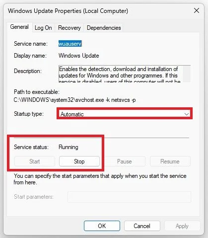 Double-click the service to access its properties, and here, in the General section, click on Start, in case the service status is set to Stopped or proceed to restart it if it’s already running. Also, make sure that the Startup type is set to Automatic. Lastly, apply your changes, and the error should be fixed.