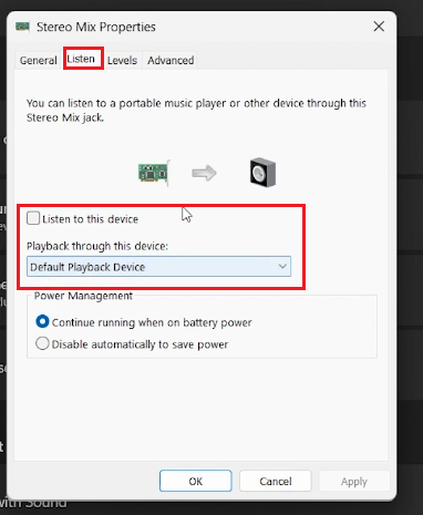 Here, select the checkbox next to Listen to this device, an essential feature to activate dual audio output.