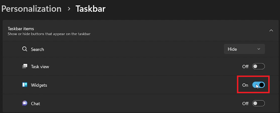 You can easily re-enable Windows Widgets through the Windows settings. Go to "Personalization" and then find "Taskbar items." Here, you can toggle the switch to enable Widgets.