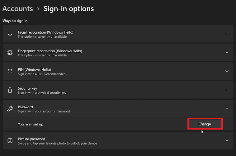 Accountstab and selectSign-In optionsto access the password settings once more.