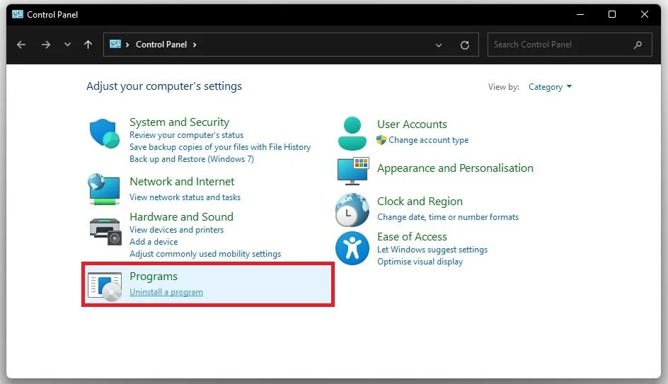 To remove an antivirus application, search for the Control Panel to open it up. View by: Category, and under Programs, select Uninstall a Program.
