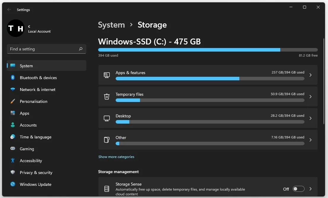 To update Windows 11 or upgrade to Windows 11, you need enough space on your hard drive for installation. To view how much hard drive space is available on your PC, search for Storage in your start menu search to open up your Storage system settings window. You can see how much space is used and available on your hard drive and how much space is being used by other applications, your temporary files, and more.