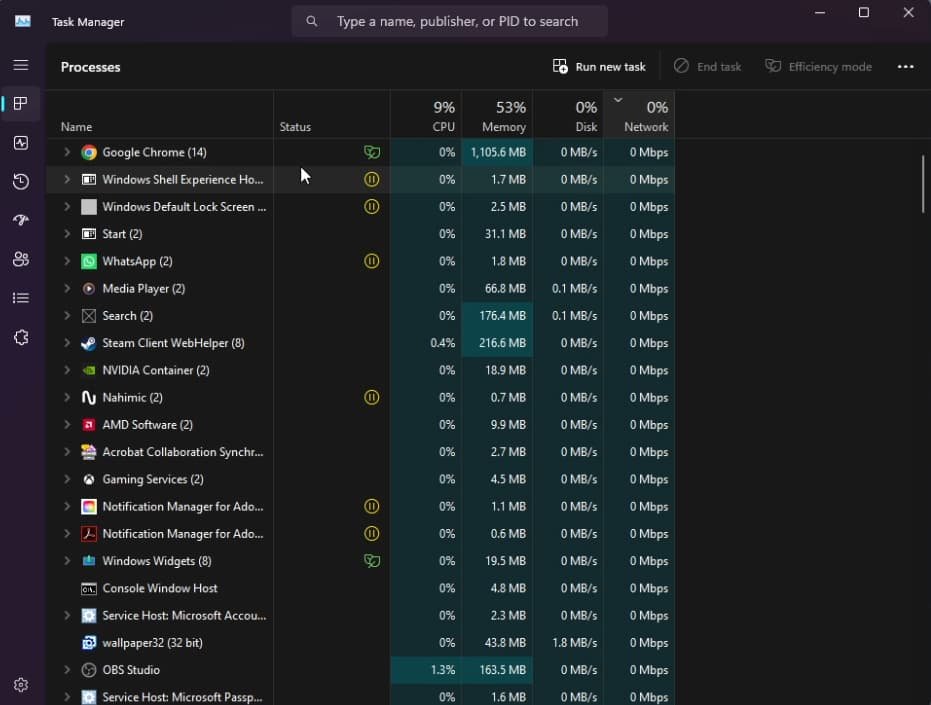 Open Task Manager (Ctrl + Shift + Esc) and go to the Processes section.