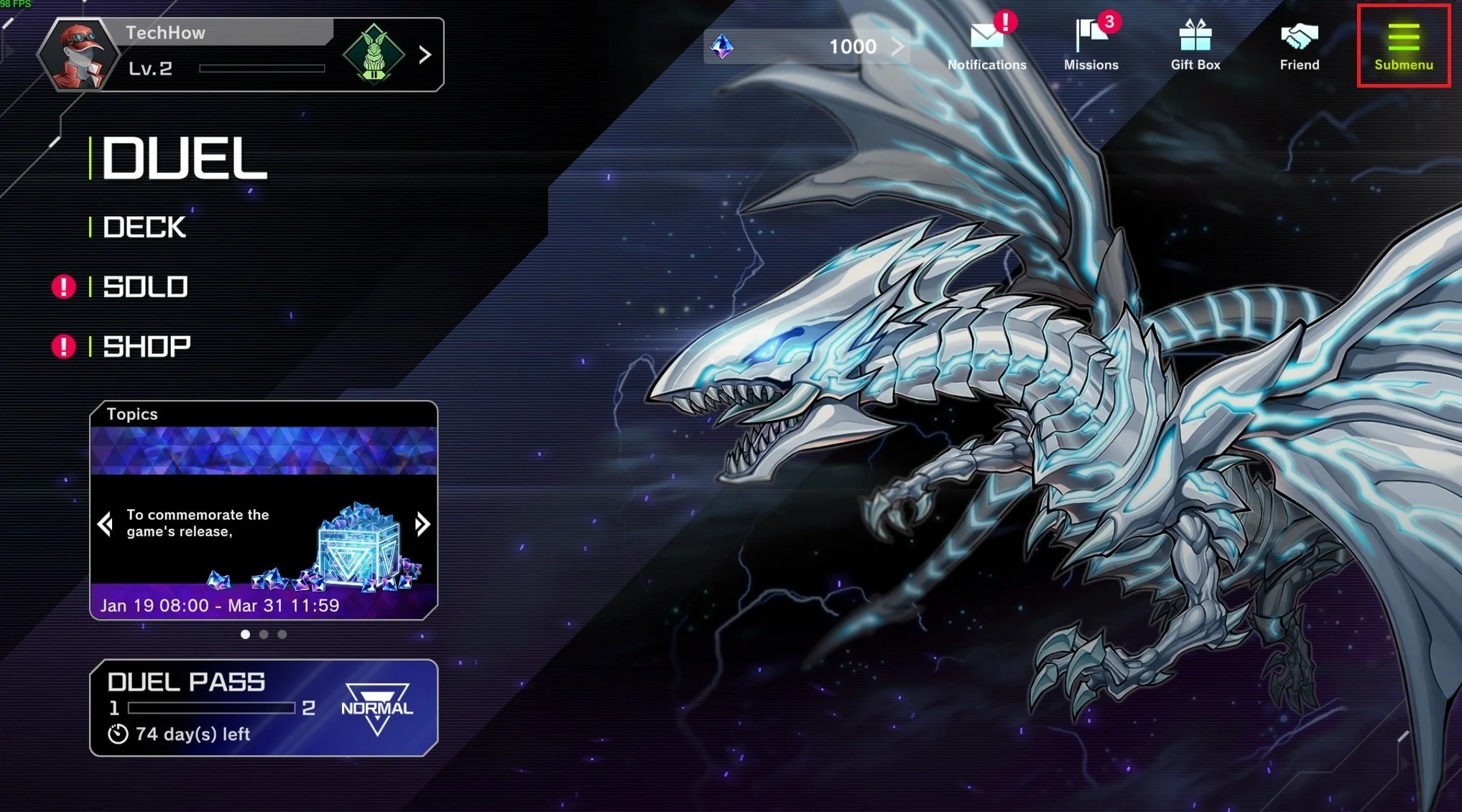 Open up Yu-Gi-Oh! Master Duel, and from your main menu, click on the Submenu icon on the top right.