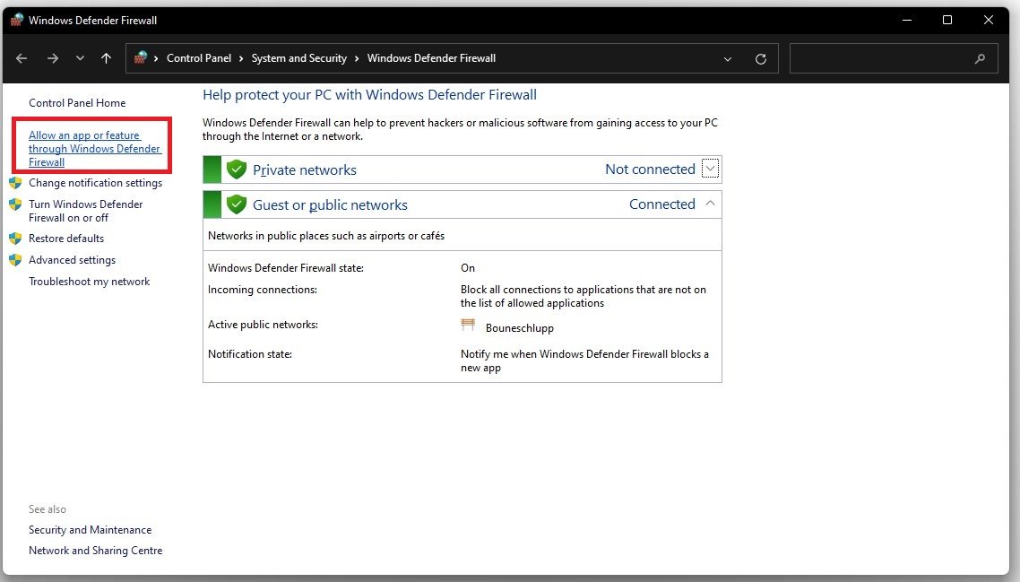Windows Defender Firewall > Allow an app through Firewall