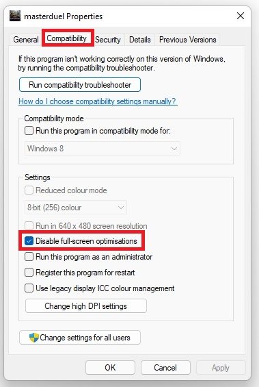 Disable Fullscreen Optimizations for Yu-Gi-Oh!