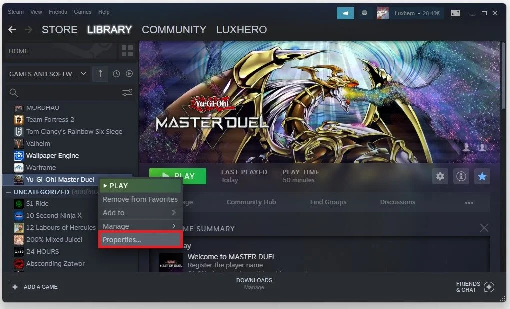 In case the problem persists, open up your Steam library. Right-click Master Duel and select Properties.