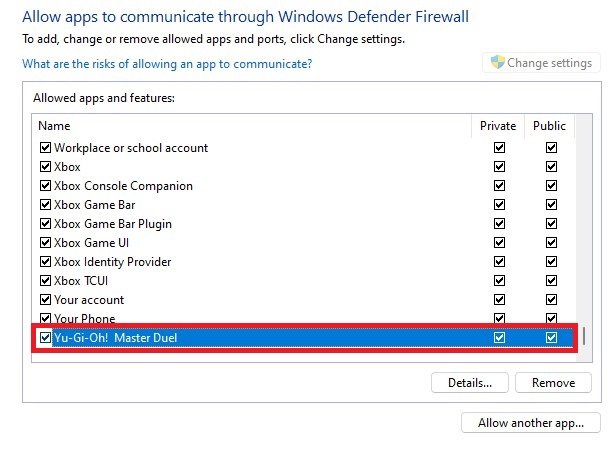 Select Change settings, search for the Yu-Gi-Oh! Master Duel application and make sure to check it. This will allow you to exclude the application from being blocked by your firewall and will, for some users prevent the issue.