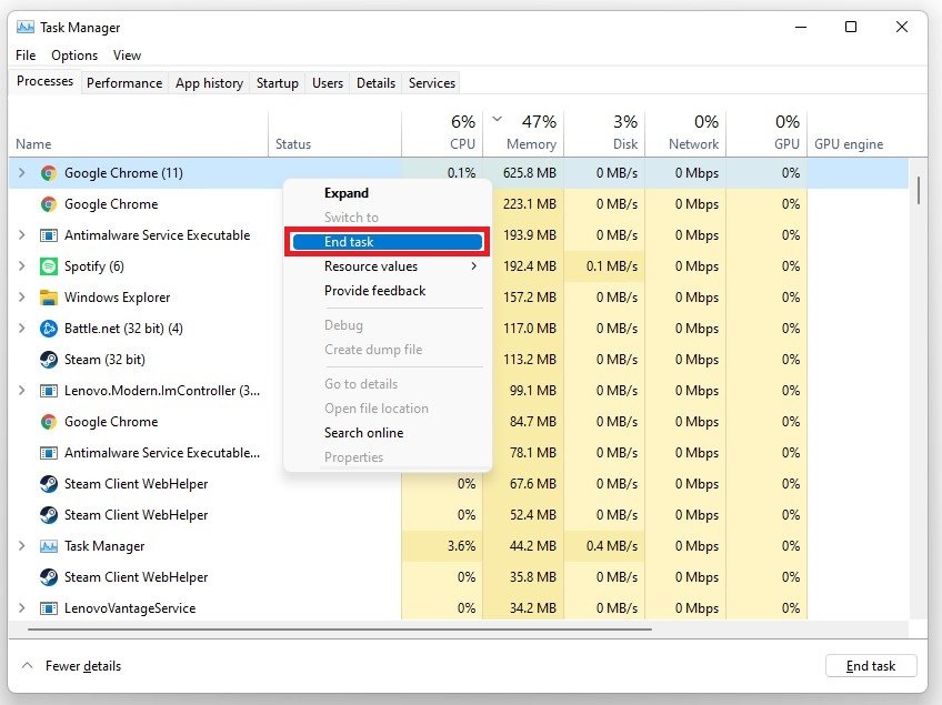 Open up your Task Manager by searching for it in your start menu search. In the Processes tab, make sure to end programs from running that could change your game files or show an overlay while playing the game. In our example, that would be CCleaner, GeForce Experience, Adobe applications, Discord, and Chrome.