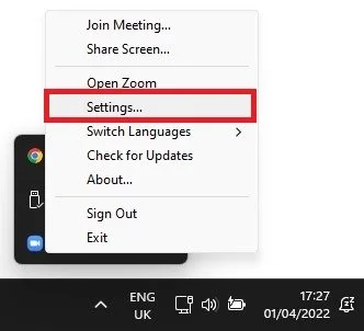 Open up Zoom, and in case you’re unable to find the window, open up your system tray and right-click the Zoom icon to access your settings.