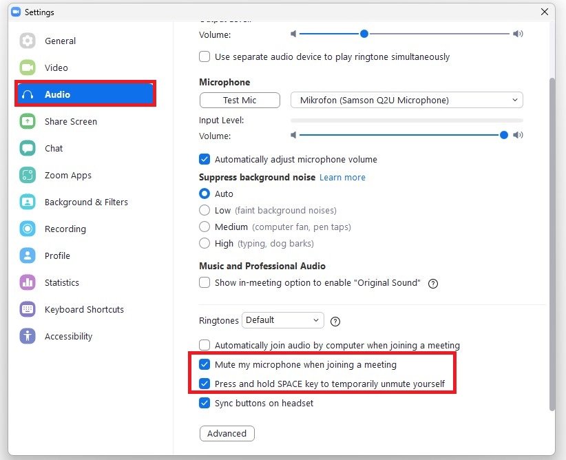 Your Zoom Audio settings window will open up. This will allow you to enable or disable the Mute my microphone when joining a meeting option. You can also make use of the Press Space to unmute yourself option below.