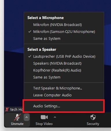 Click on the little arrow icon next to the microphone icon. Here, click on Audio Settings.